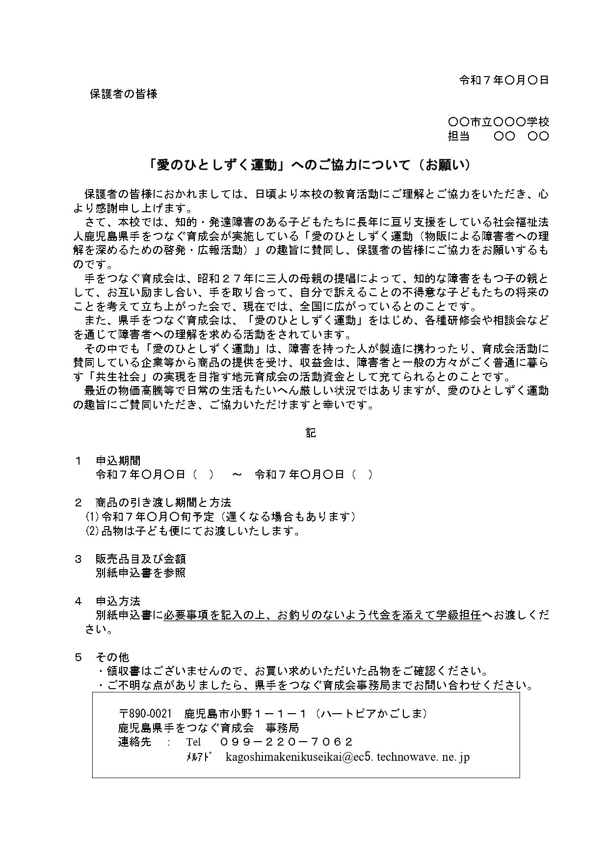 「愛のひとしずく運動」における学校(担当者)から保護者向けの協力依頼文書について