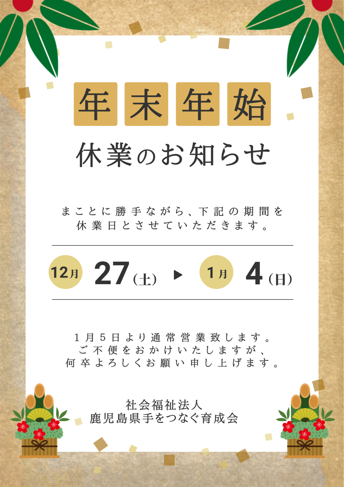 休業期間中に頂きましたお問い合わせやFAXへのご返答は1月5日(月)以降となります。皆様にはご迷惑をお掛け致しますが、ご理解の程よろしくお願い申し上げます。